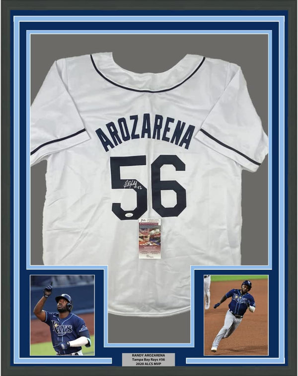 Framed Autographed/Signed Randy Arozarena 35x39 Tampa Bay White Baseball Jersey JSA COA