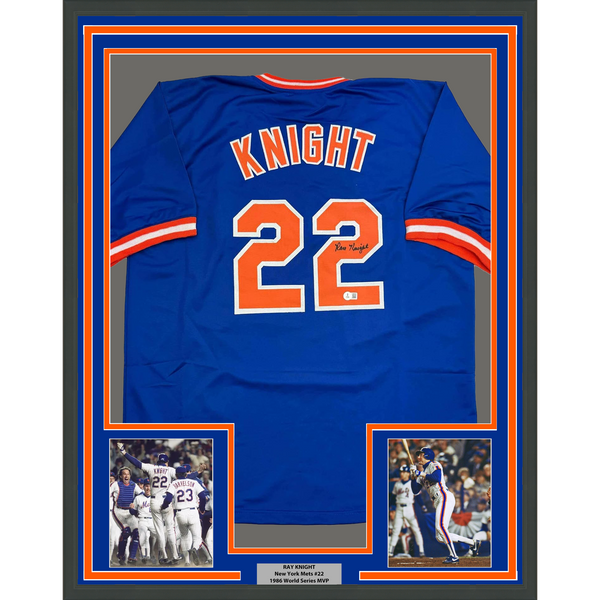 Framed Autographed/Signed Ray Knight 35x39 New York Blue Baseball Jersey Beckett BAS COA