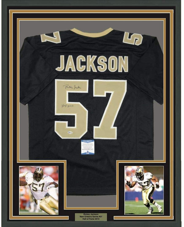 Framed Autographed/Signed Rickey Jackson HOF 2010 35x39 New Orleans Black Football Jersey Beckett BAS COA