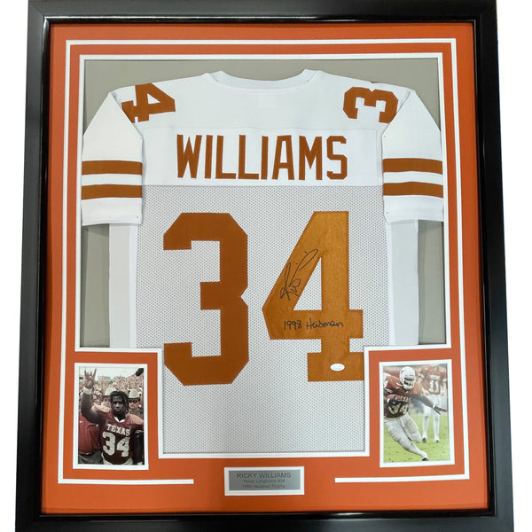 Framed Autographed/Signed Ricky Williams 35x39 1998 Heisman Texas Longhorns White Football Jersey JSA COA
