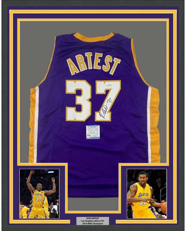 Framed Autographed/Signed Ron Artest 35x39 Los Angeles LA Purple Basketball Jersey PSA/DNA COA