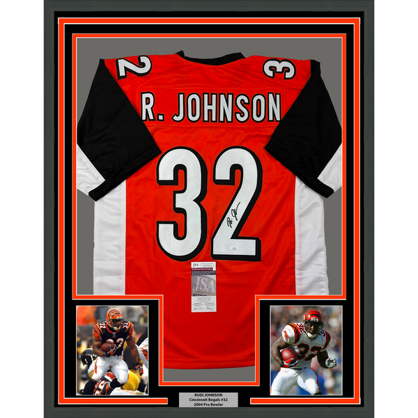 Framed Autographed/Signed Rudi Johnson 35x39 Cincinnati Orange Football Jersey JSA COA