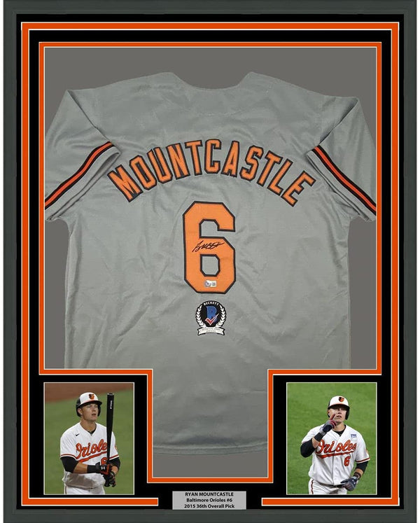 Framed Autographed/Signed Ryan Mountcastle 35x39 Baltimore Grey Baseball Jersey Beckett BAS COA