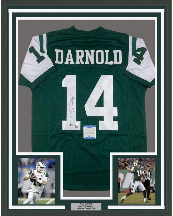 Framed Autographed/Signed Sam Darnold 35x39 New York Green Rookie Football Jersey Beckett BAS COA