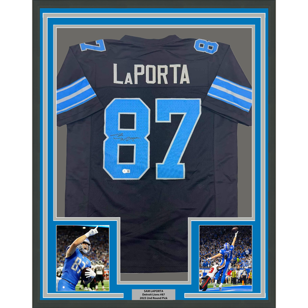 Framed Autographed/Signed Sam LaPorta 35x39 Detroit Black Football Jersey Beckett BAS COA