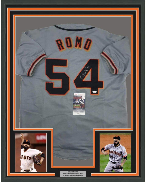 Framed Autographed/Signed Sergio Romo 35x39 San Francisco Grey Baseball Jersey JSA COA