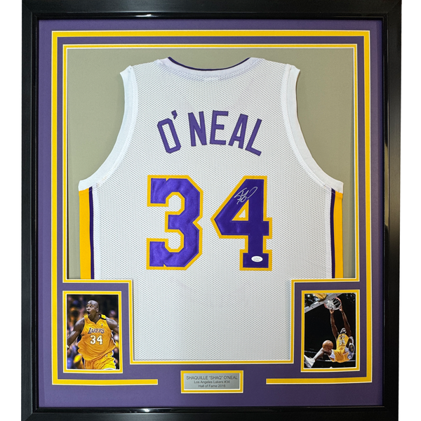 Framed Autographed/Signed Shaquille Shaq O'Neal 35x39 Los Angeles LA White Basketball Jersey JSA COA