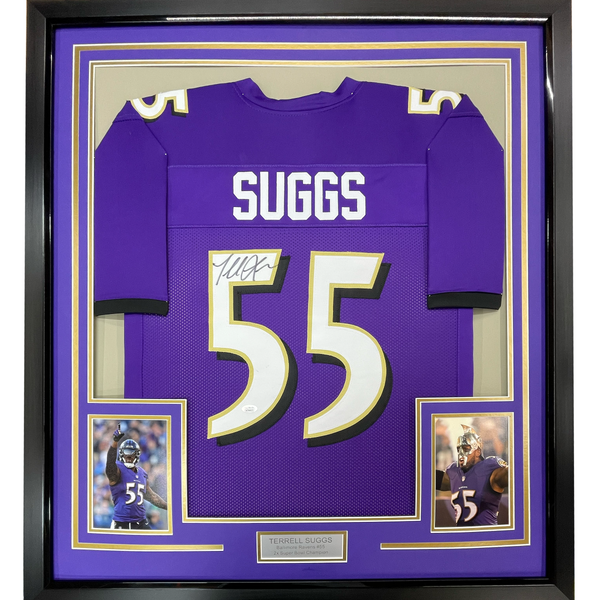 Framed Autographed/Signed Terrell Suggs 35x39 Baltimore Purple Football Jersey JSA COA