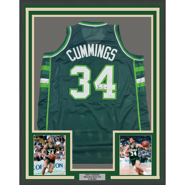Framed Autographed/Signed Terry Cummings 35x39 Milwaukee Green Basketball Jersey Beckett BAS COA