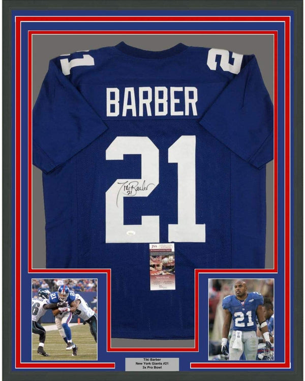 Framed Autographed/Signed Tiki Barber 35x39 New York Blue Football Jersey JSA COA