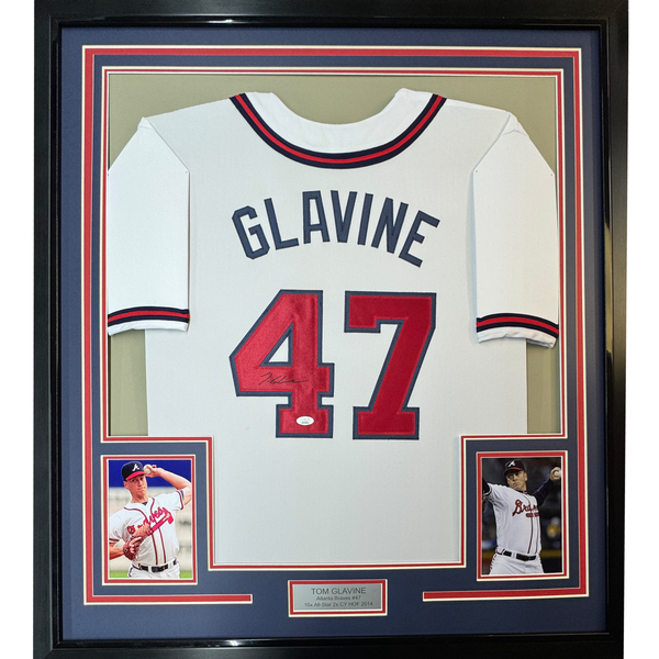 Framed Autographed/Signed Tom Glavine 35x39 Atlanta White Baseball Jersey JSA COA