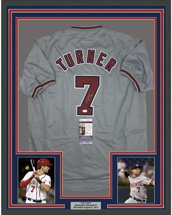 Framed Autographed/Signed Trea Turner 35x39 Washington Grey Baseball Jersey JSA COA