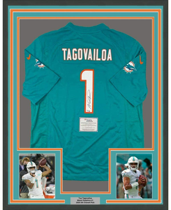 Framed Autographed/Signed Tua Tagovailoa 35x39 Miami Dolphins Authentic Teal Nike Game Football Jersey Fanatics COA