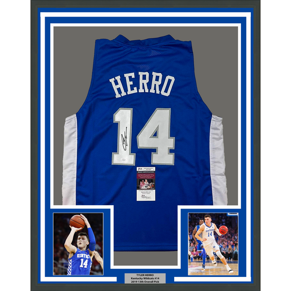 Framed Autographed/Signed Tyler Herro 35x39 Kentucky Blue College Basketball Jersey JSA COA
