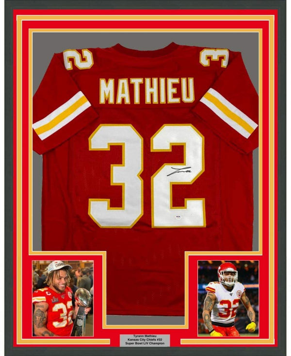 Framed Autographed/Signed Tyrann Mathieu 35x39 Kansas City Red Football Jersey PSA/DNA COA