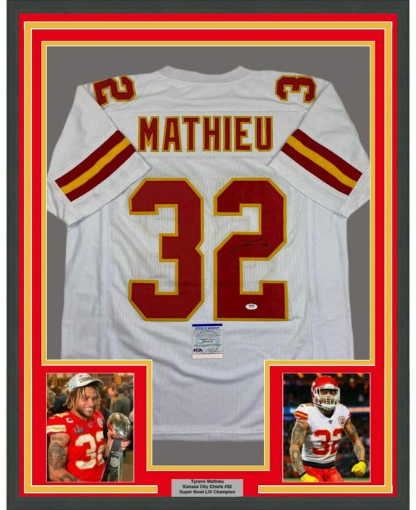 Framed Autographed/Signed Tyrann Mathieu 35x39 Kansas City White Football Jersey PSA/DNA COA