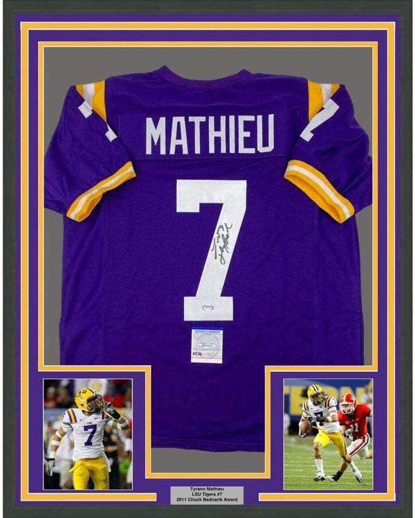 Framed Autographed/Signed Tyrann Mathieu Inscribed Honey Badger 35x39 LSU Purple College Football Jersey PSA/DNA COA
