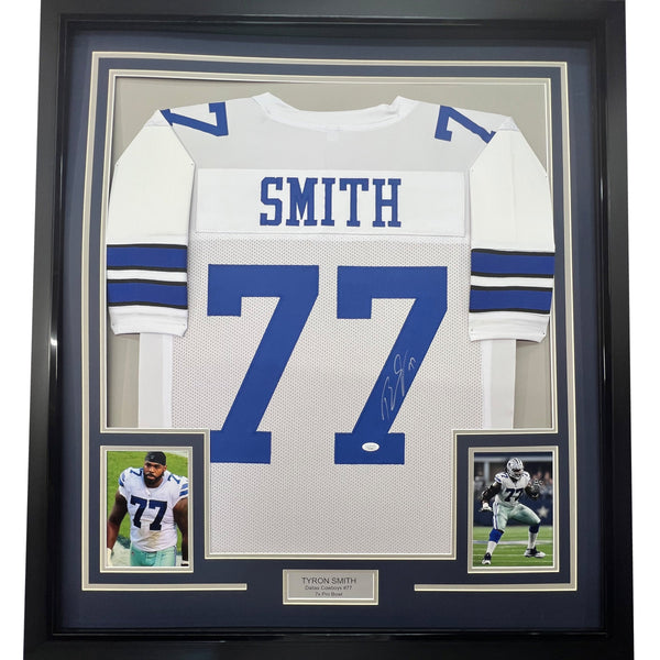 Framed Autographed/Signed Tyron Smith 35x39 Dallas White Football Jersey JSA COA