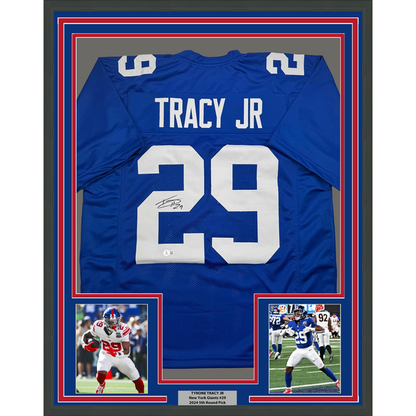 Framed Autographed/Signed Tyrone Tracy Jr. 35x39 New York Blue Football Jersey Beckett BAS COA