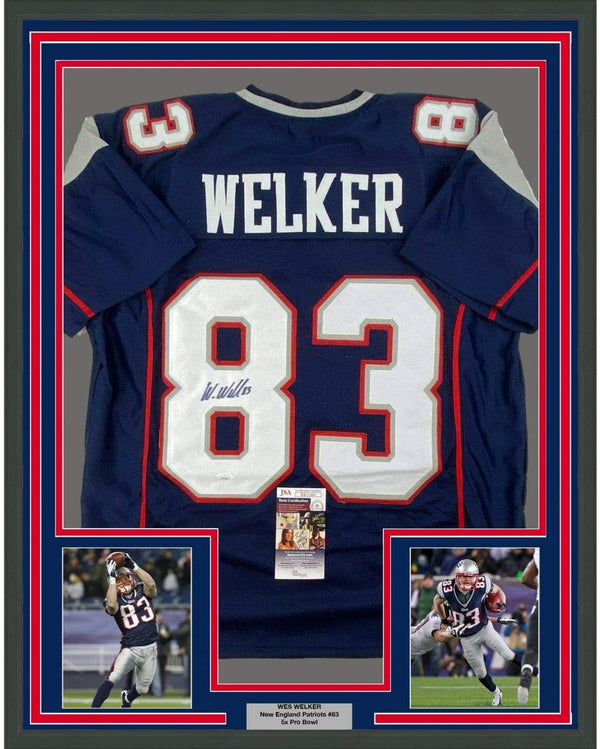 Framed Autographed/Signed Wes Welker 35x39 New England Blue Football Jersey JSA COA