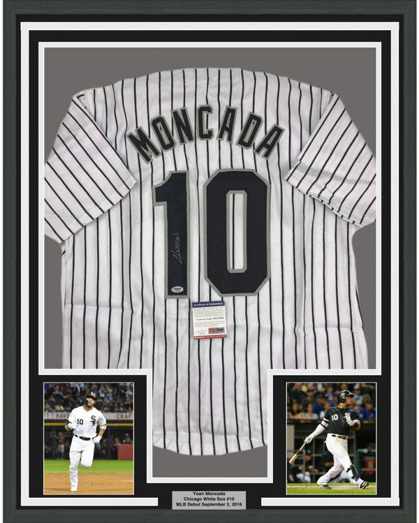 Framed Autographed/Signed Yoan Moncada 35x39 Chicago Pinstripe Baseball Jersey Beckett BAS COA