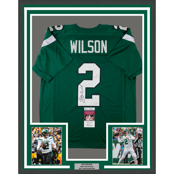 Framed Autographed/Signed Zach Wilson 35x39 New York Green Football Jersey JSA COA