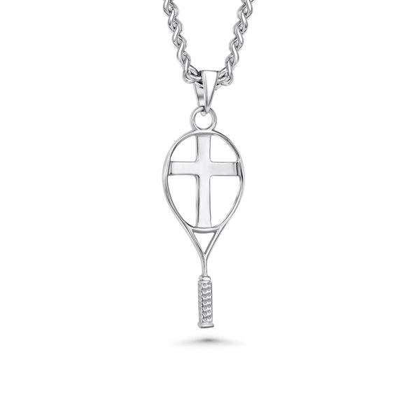 This pendant is available in tarnish-resistant sterling silver (0.925). The design features a finely detailed tennis racket with a polished cross silhouette placed perfectly in the center, symbolizing faith at the heart of the game. The grip of the racket is carefully crafted with extra detail, giving the pendant a unique touch that sets it apart from traditional sports jewelry.