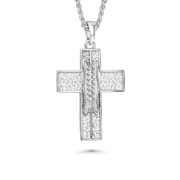 The design features a classic cross silhouette with intricate football-inspired details. The inner texture of the cross is carefully crafted to resemble the look and feel of pigskin leather, giving it an authentic football appearance. Running down the center are raised laces, completing the design and making the football connection instantly recognizable. This unique blend of sport and faith creates a pendant that is both meaningful and eye-catching.